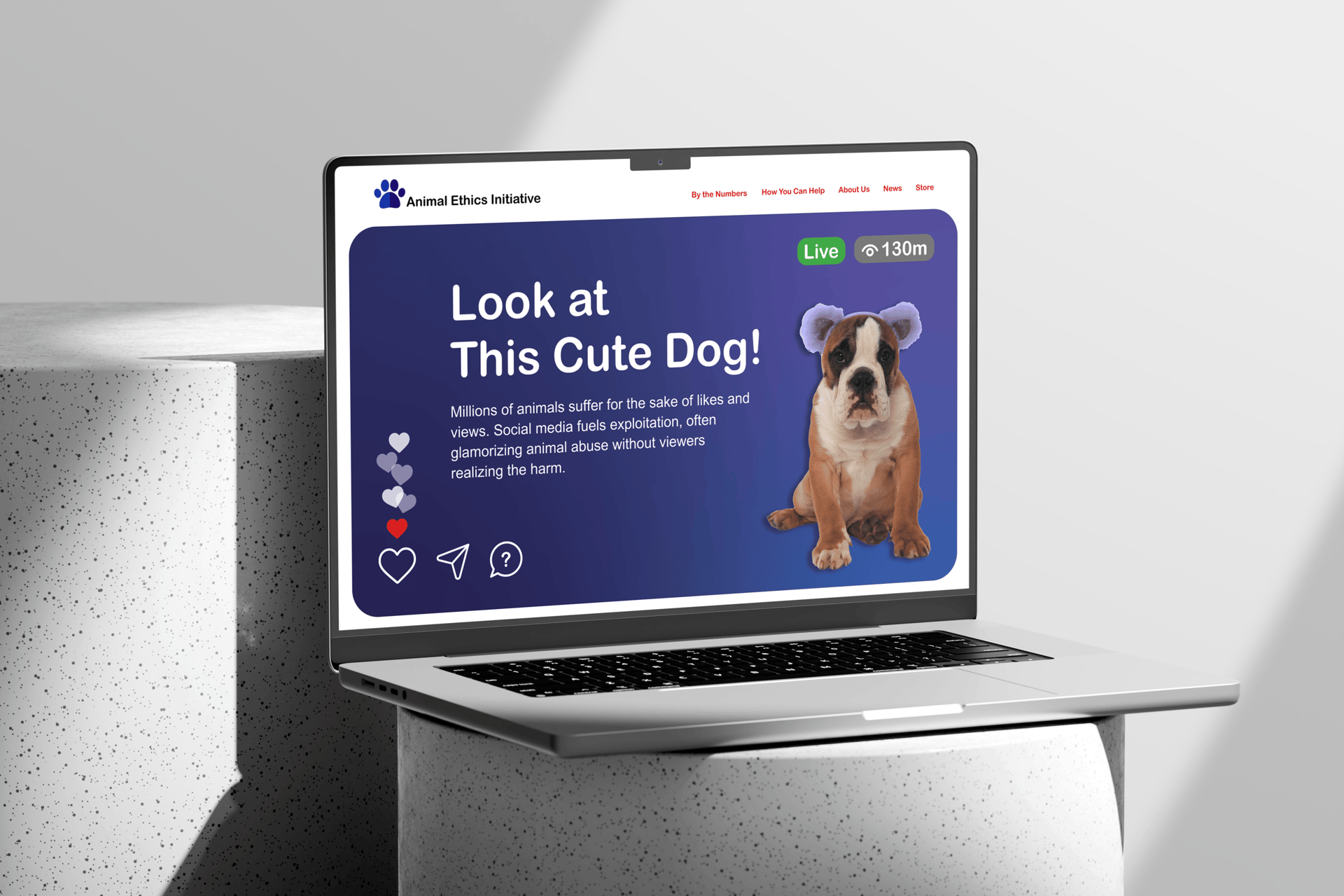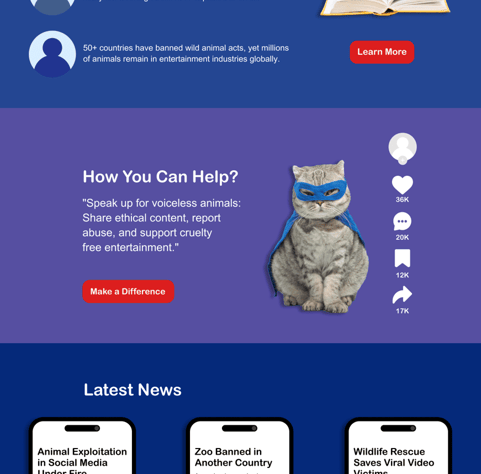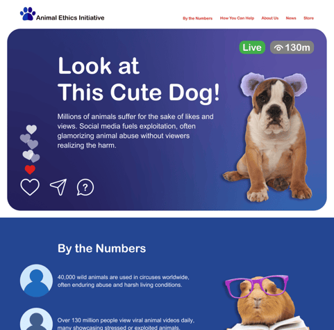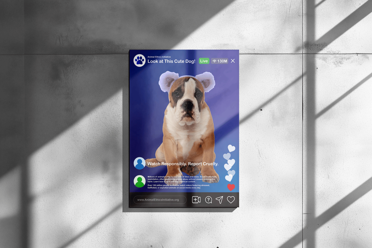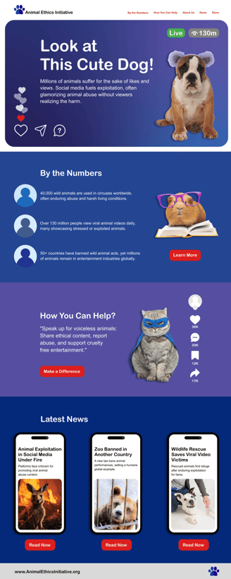 In this project, I aimed to raise awareness about the exploitation of pets for acrobatic tricks and the use of costumes for social media attention. I designed a poster inspired by Instagram Live, where the focus was on the discomfort and misery of animals being used in this way. The visuals feature sad and unsettling images of animals to highlight the issue. I extended this theme to the design of a website, using the same stark imagery to convey the message that pets should not be treated as props for online fame. The goal was to spark empathy and encourage a shift in how we view and treat animals on social media.