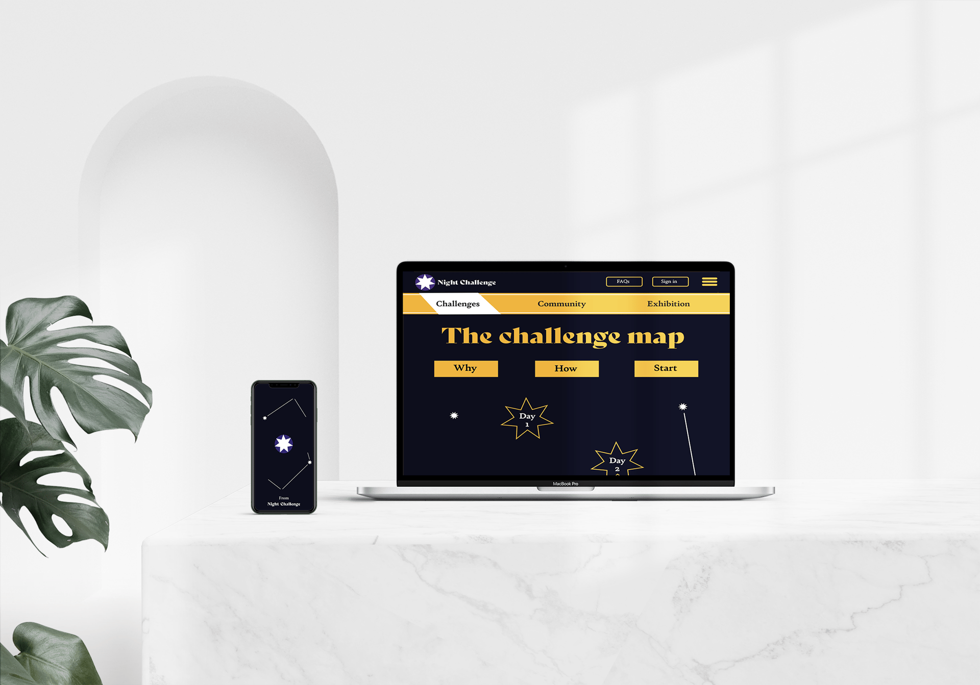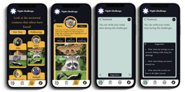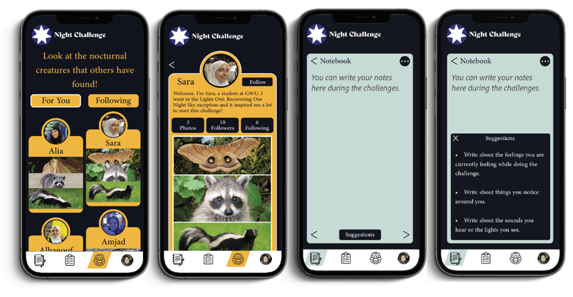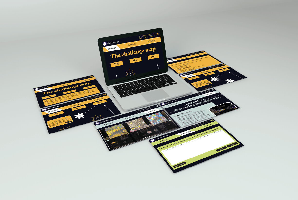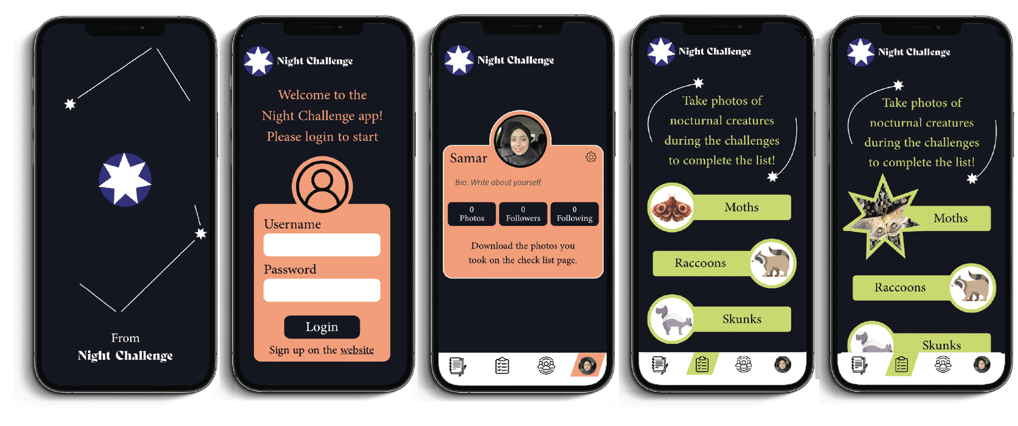 For this semester-long project, I chose to design a website and mobile app inspired by the Lights Out: Recovering Our Night Sky exhibition at the Smithsonian Museum. The Night Challenge aims to raise awareness about light pollution by encouraging users to reduce their use of artificial lights after sunset. The challenge spans a full year, motivating participants to go outdoors each night, observe the sky, and discover nocturnal creatures. The website provides a platform for users to track their progress and engage with the community through discussion forums. The mobile app complements this experience by allowing users to document their encounters with nocturnal creatures, upload photos, and create a yearly album of their journey. Additionally, users can view and share photos with friends, fostering a sense of connection and shared purpose in preserving our night sky.