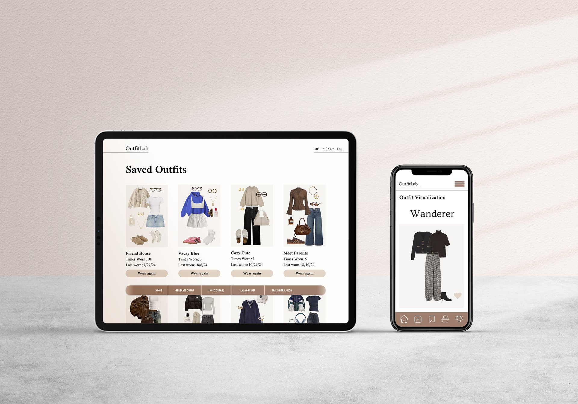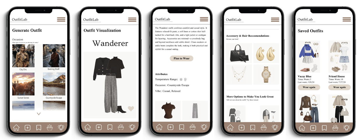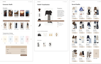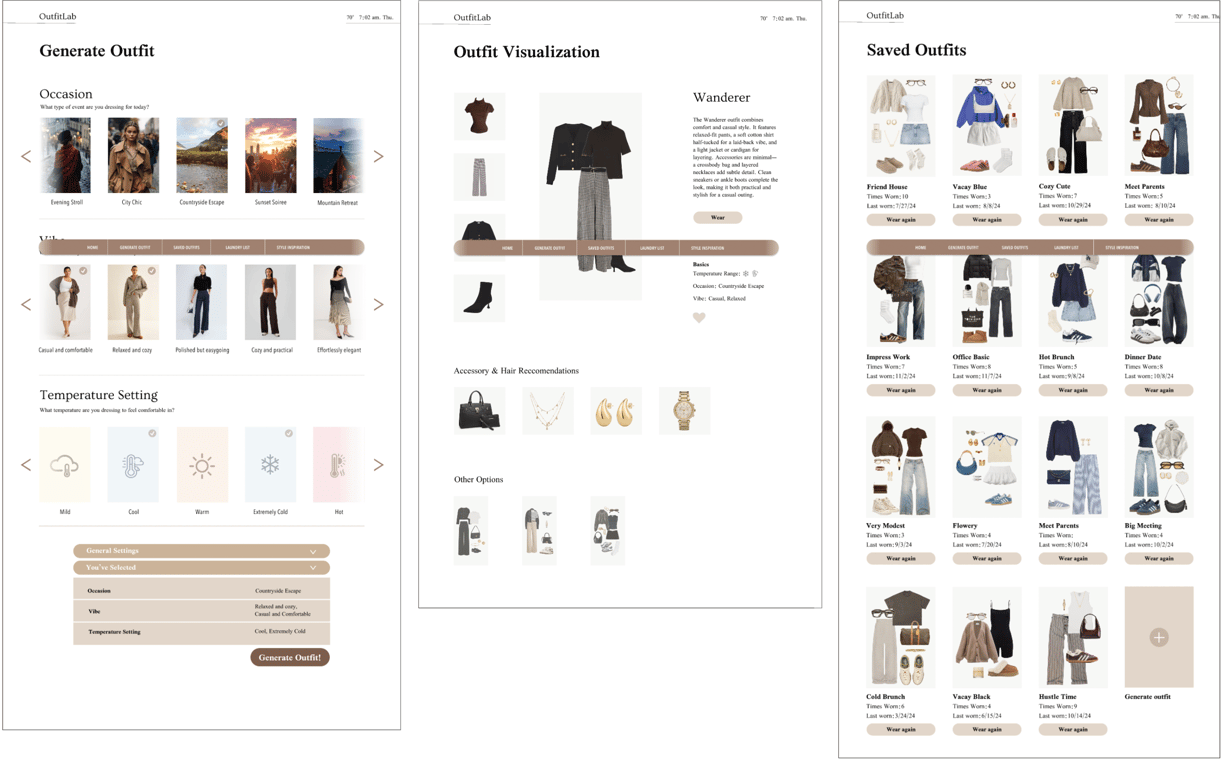 For this collaborative project, my group and I designed a screen app and mobile app centered around a modern solution for wardrobe management. We created an electronic screen that can be hung inside your closet to help coordinate outfits based on your personal taste. The system not only suggests daily looks but can also be accessed through a mobile app for convenience. The design follows a sleek, modern aesthetic with a neutral beige color palette, ensuring a minimalistic and elegant user experience. The goal of this project was to combine technology with fashion to make outfit planning seamless and intuitive.