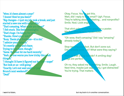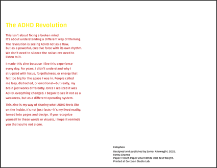 This project is a self-published zine that explores the internal experience of living with ADHD. Through minimal text, layered visuals, and intentional design choices, the zine captures moments of distraction, sensory overload, hyperactivity, and emotional struggle. Each page reflects a different aspect of how the mind rebels against traditional expectations of focus and order. The project aims to challenge common misconceptions about ADHD and present it as a different—but equally powerful—way of thinking. Designed for a pop-up exhibition at Maketto, the zine connects personal storytelling with broader conversations about mental health and neurodiversity.