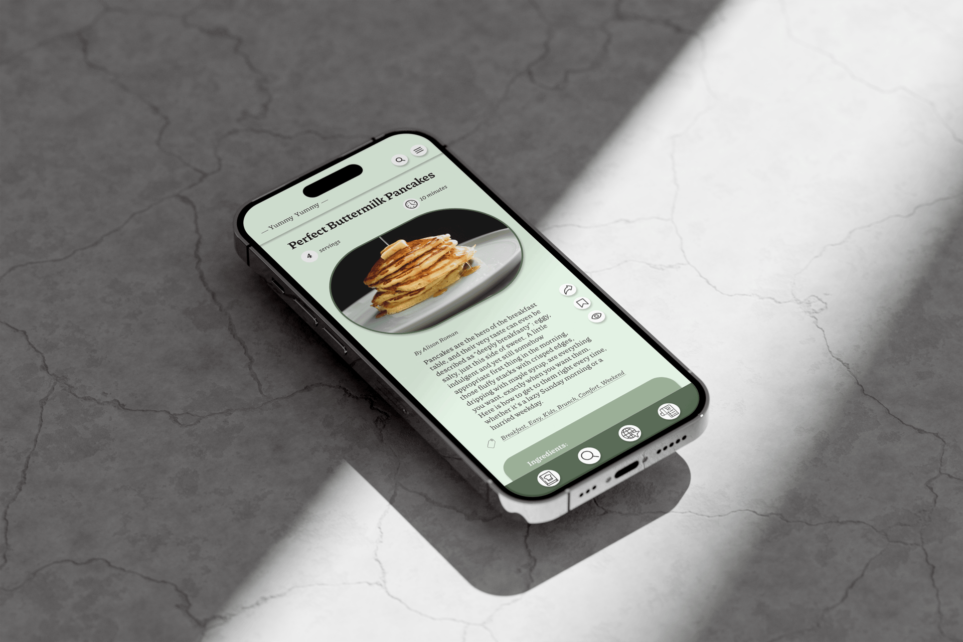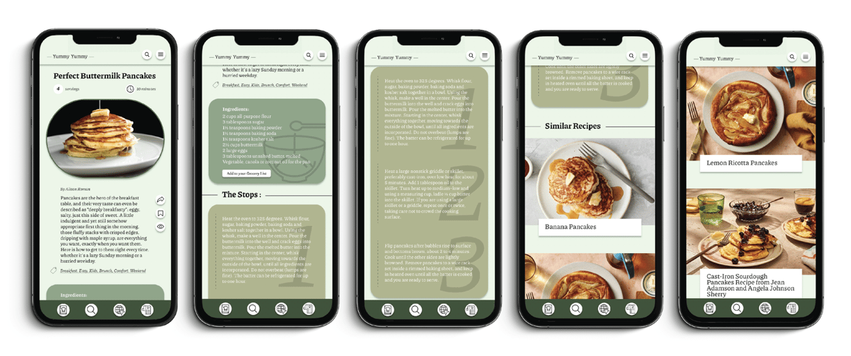 In my UX/UI class, I designed a mobile app for cooking recipes, focusing on creating an easy-to-use interface for busy cooks. For my specific page, I developed a simple and clear recipe guide for cooking pancakes. I chose a green color scheme to symbolize freshness and nature, aligning with the theme of wholesome food. The app, named Yummy Yummy, was designed with a user-friendly layout, ensuring that the recipe steps are easy to follow and visually accessible, allowing users to cook without distractions or confusion.